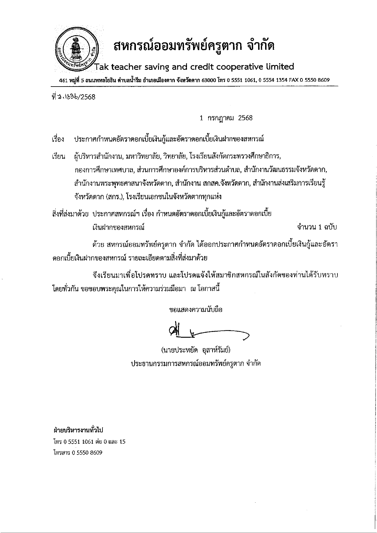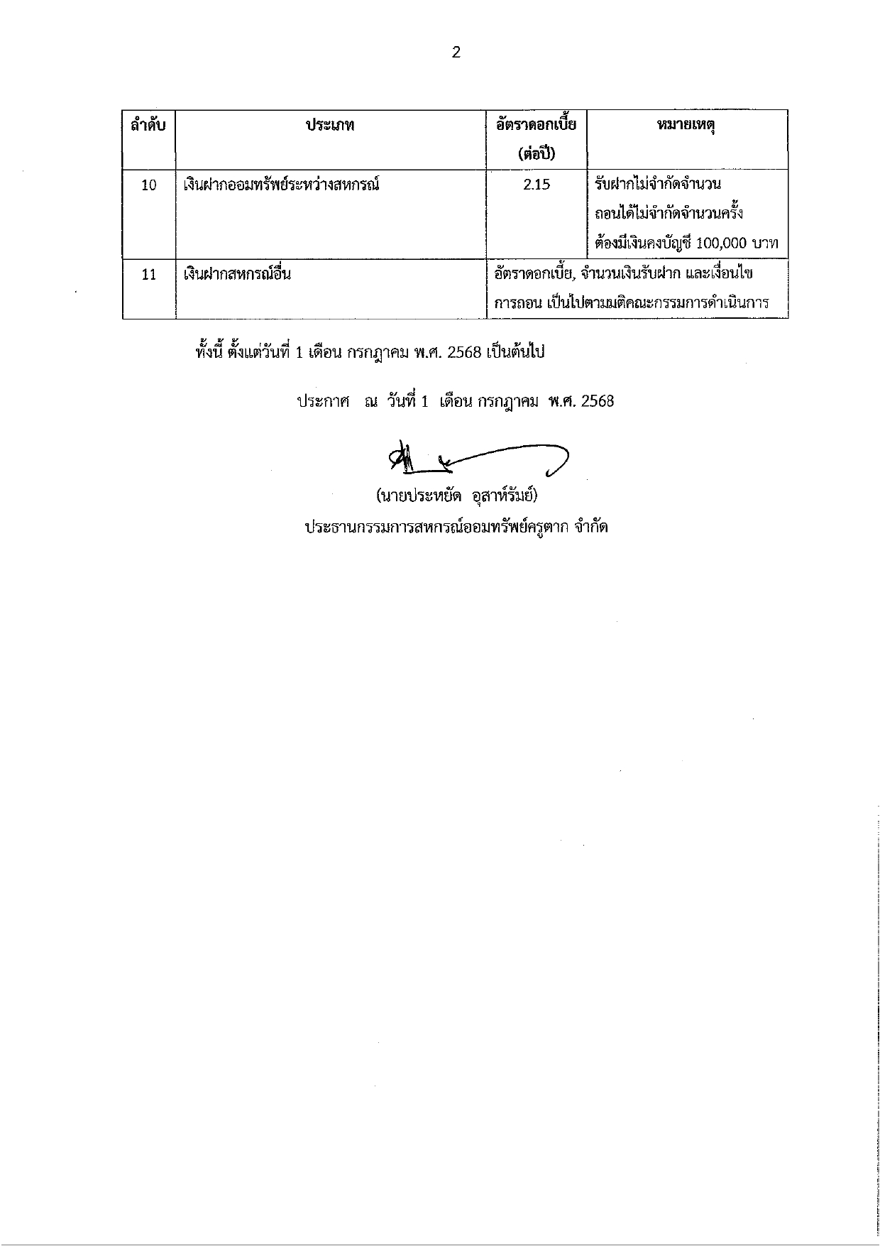 ประกาศ กำหนดอัตราดอกเบี้ยเงินกู้และอัตราเงินฝากของสหกรณ์
