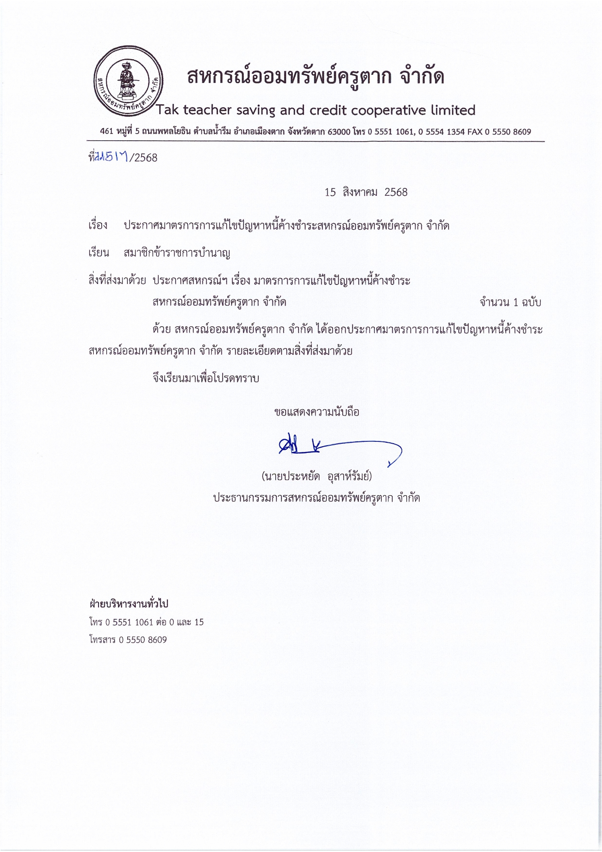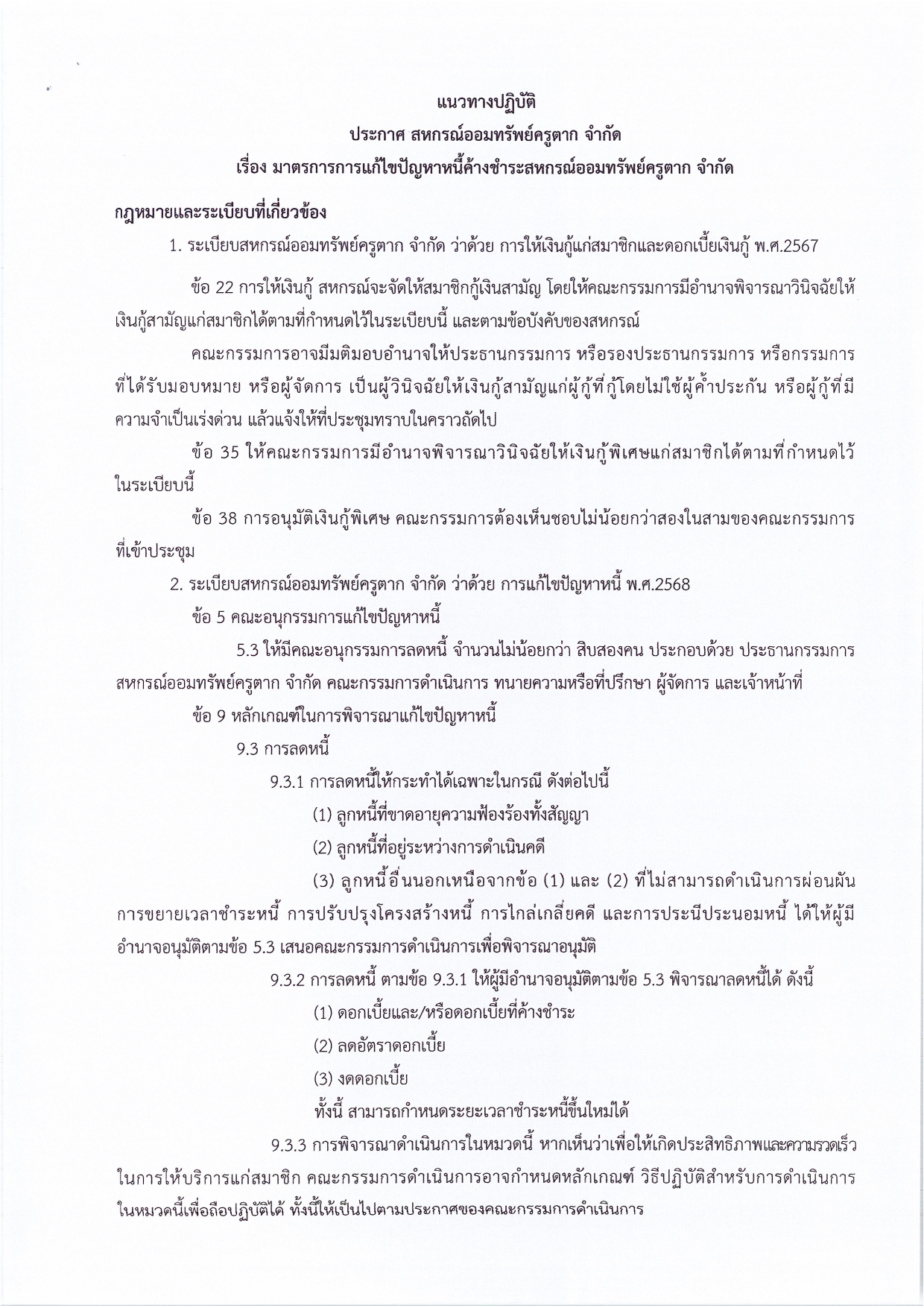 ประกาศ มาตรการการแก้ไขปัญหาหนี้ค้างชำระสหกรณฯ