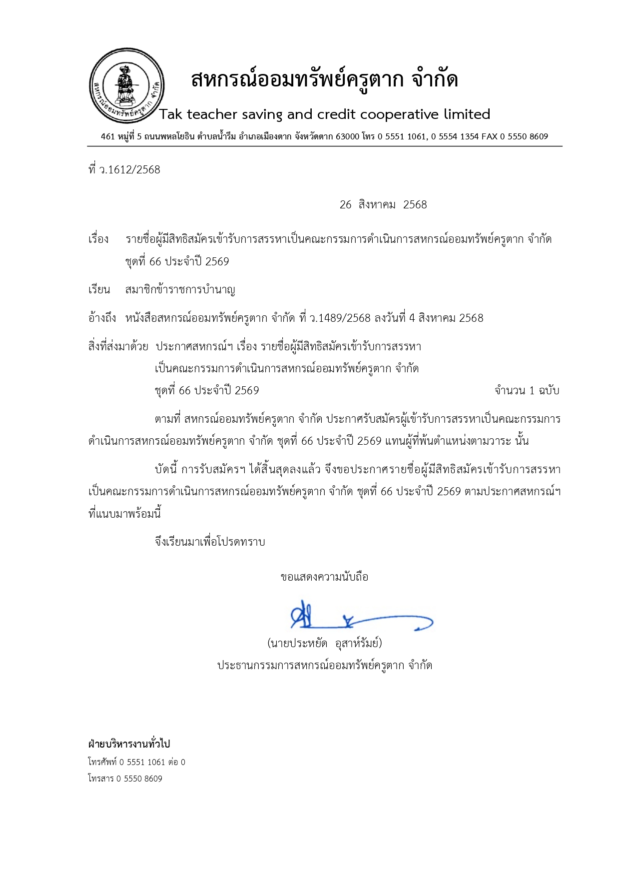 ประกาศ รายชื่อผู้มีสิทธิสมัครเข้ารับการสรรหาเป็นคณะกรรมการดำเนินการสหกรณ์ฯ