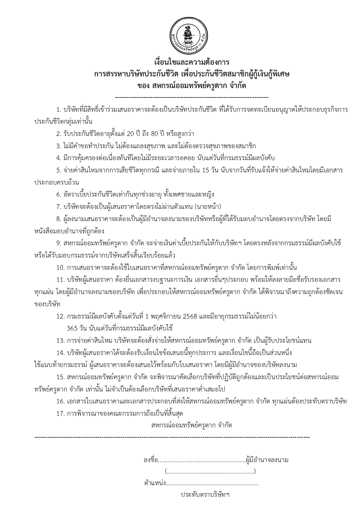ประกาศ การพิจารณาบริษัทประกันชีวิตกลุ่ม เพื่อหลักประกันเงินกู้พิเศษ ปี 2569