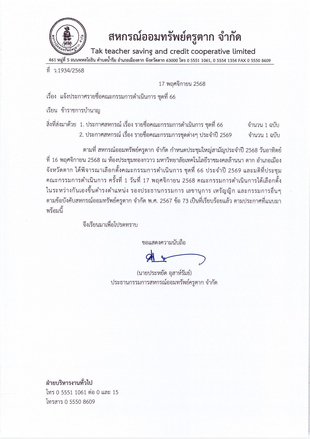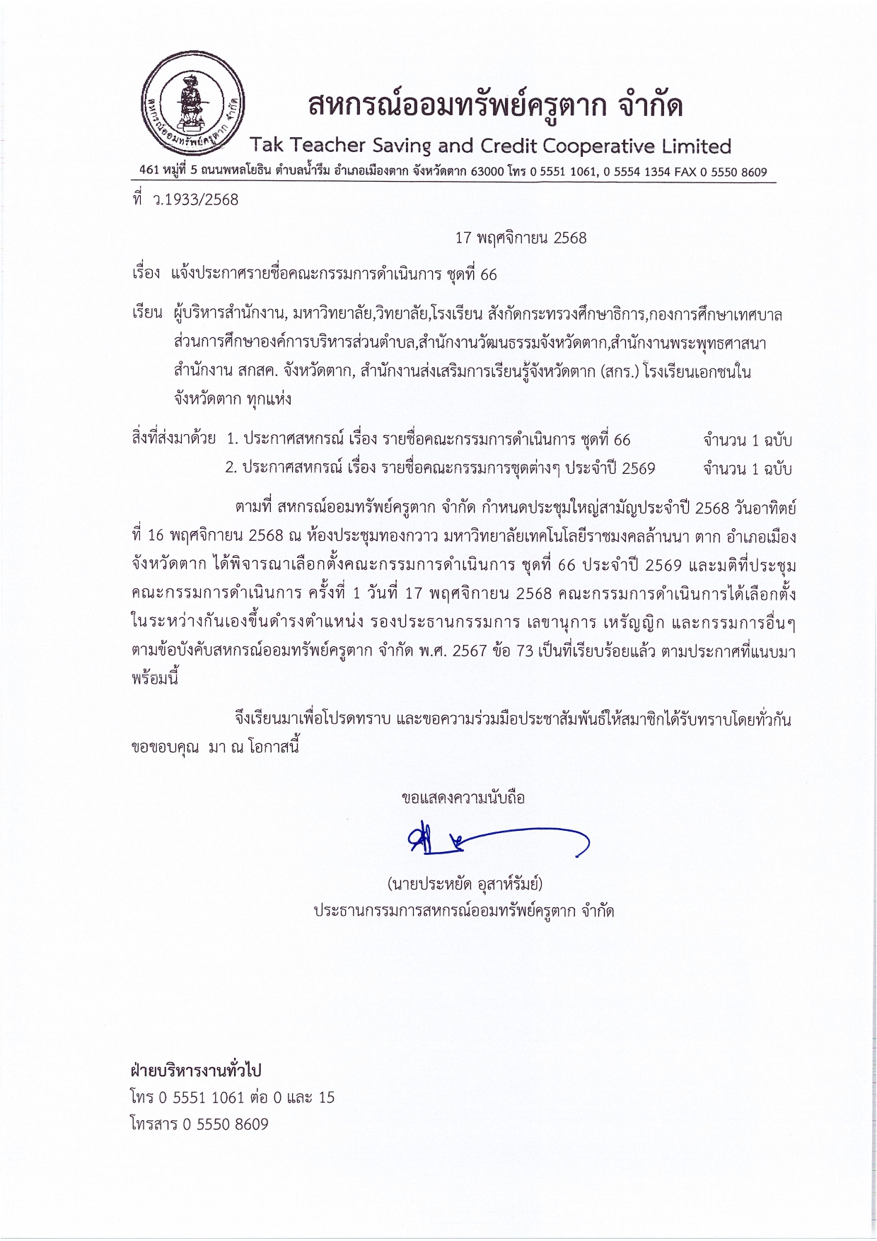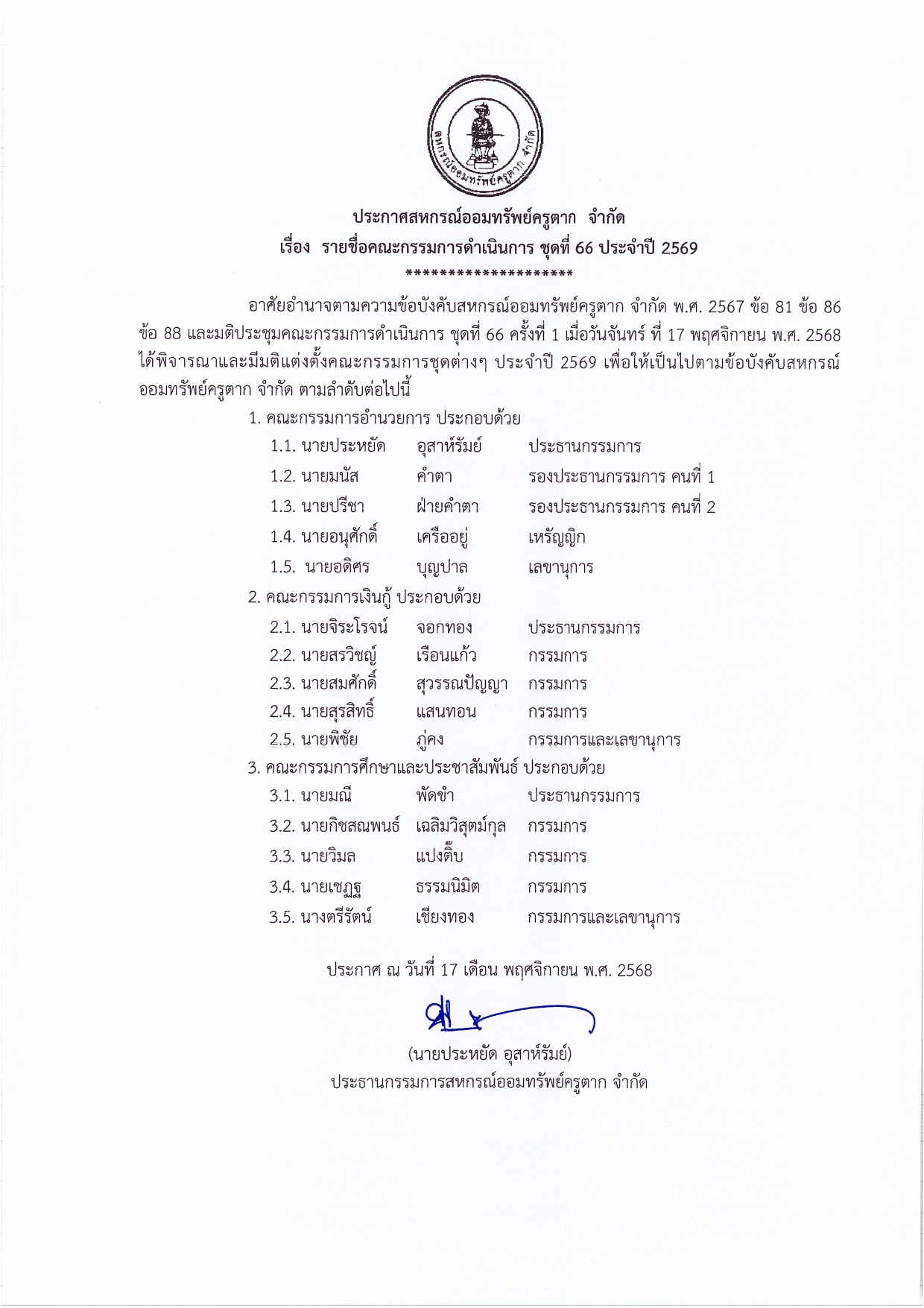 ประกาศ รายชื่อคณะกรรมการดำเนินการ ชุดที่ 66