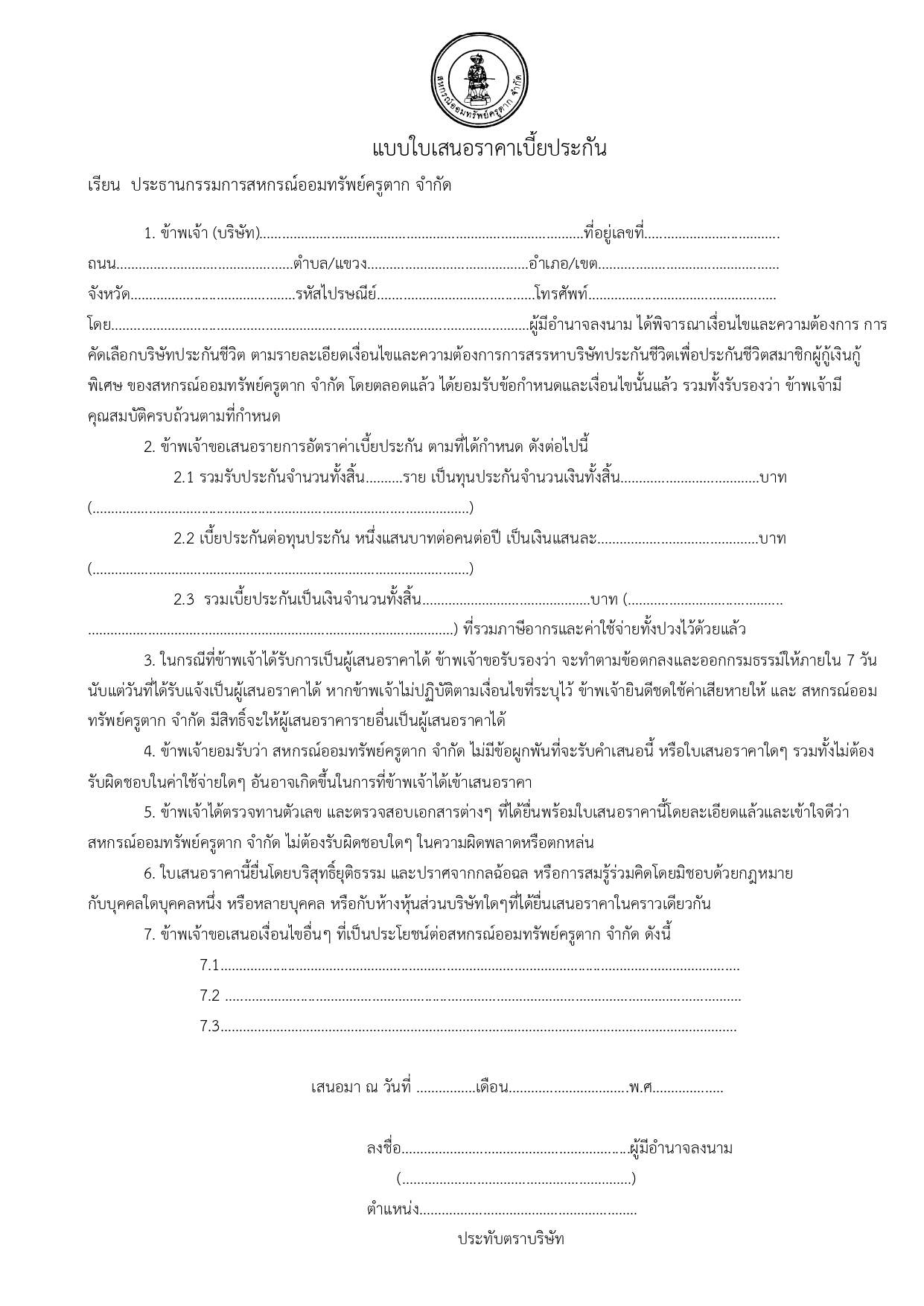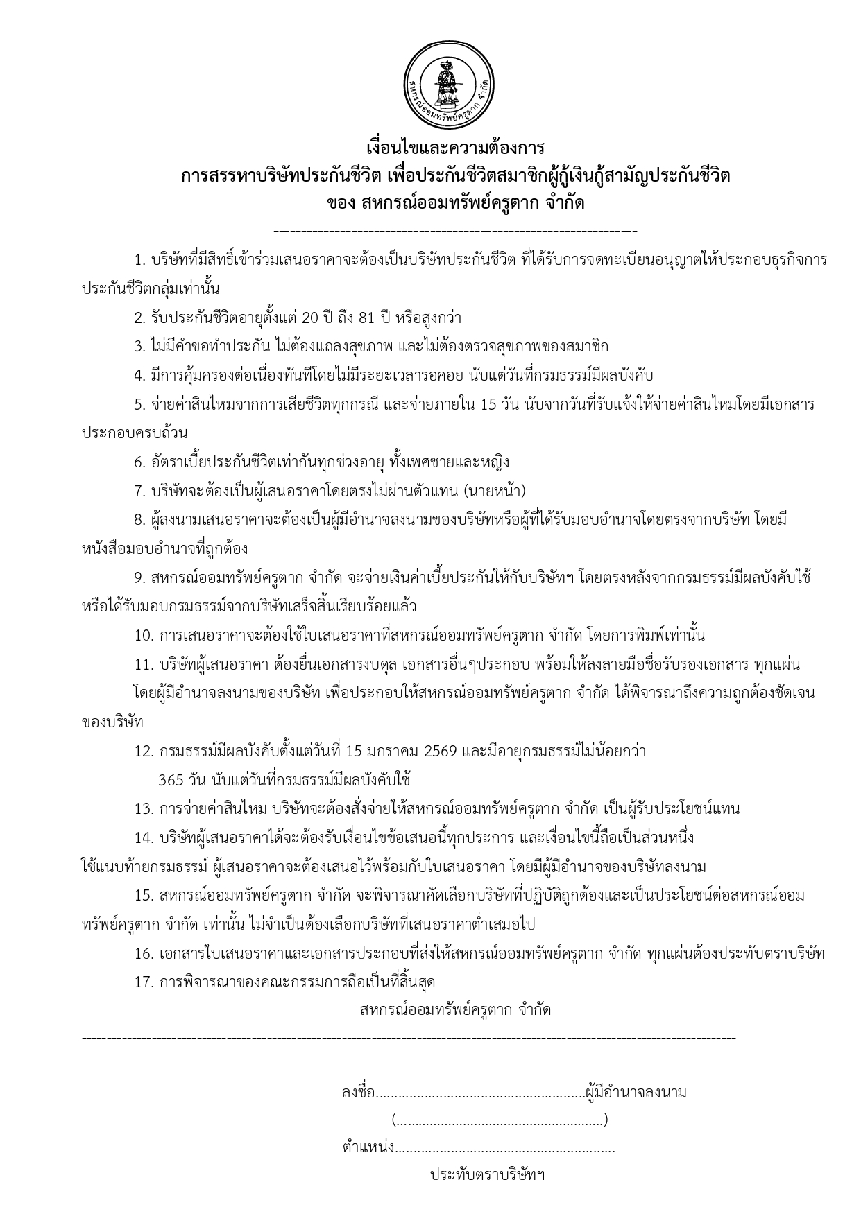 ประกาศ การพิจาณาบริษัทหลักประกันชีวิตเพื่อทำประกันเงินกู้สามัญฯ ปี2569