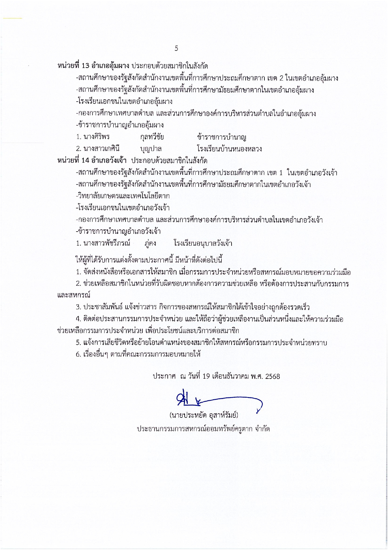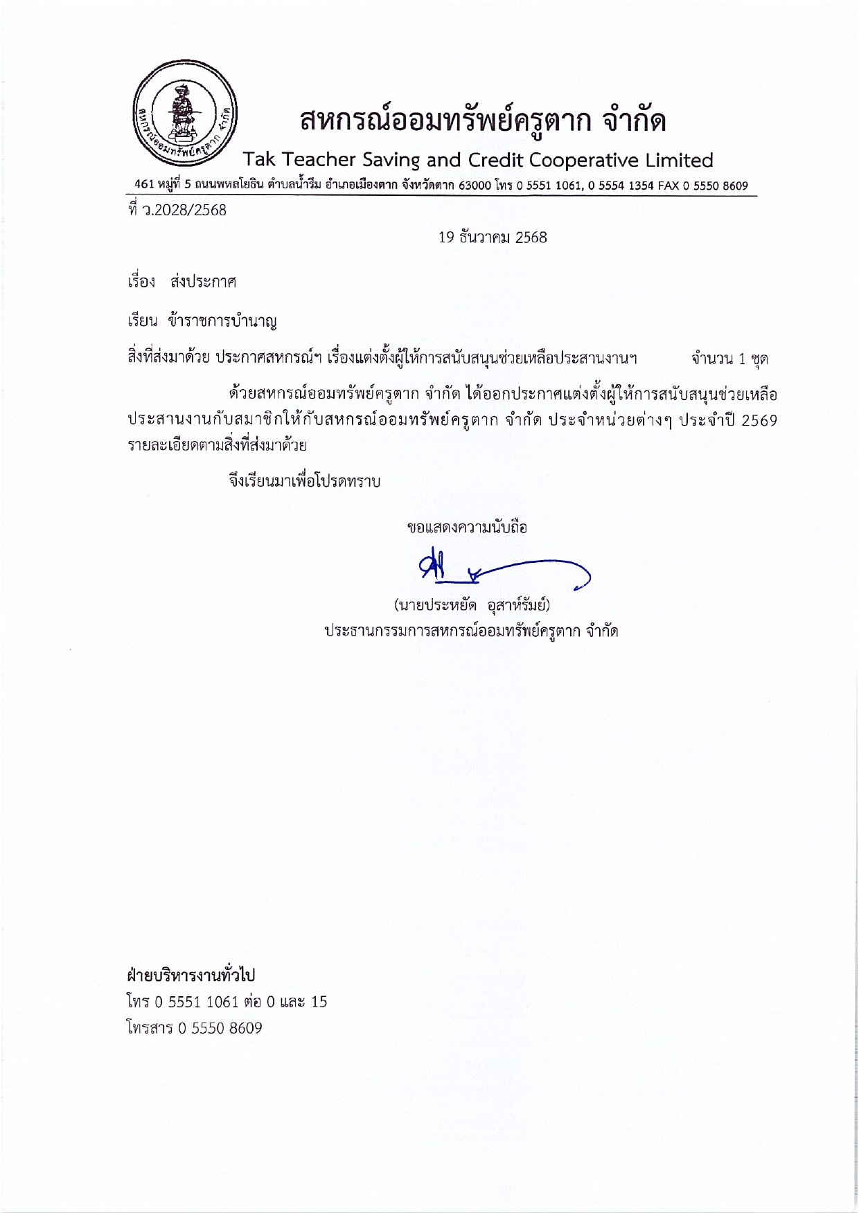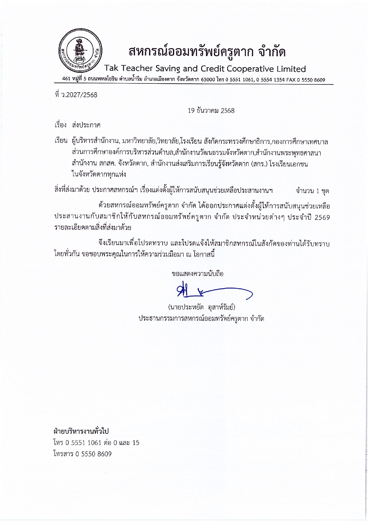 ประกาศ แต่งตั้งผู้ให้การสนับสนุนช่วยเหลือประสานงานกับสมาชิกฯ ประจำปี 2569