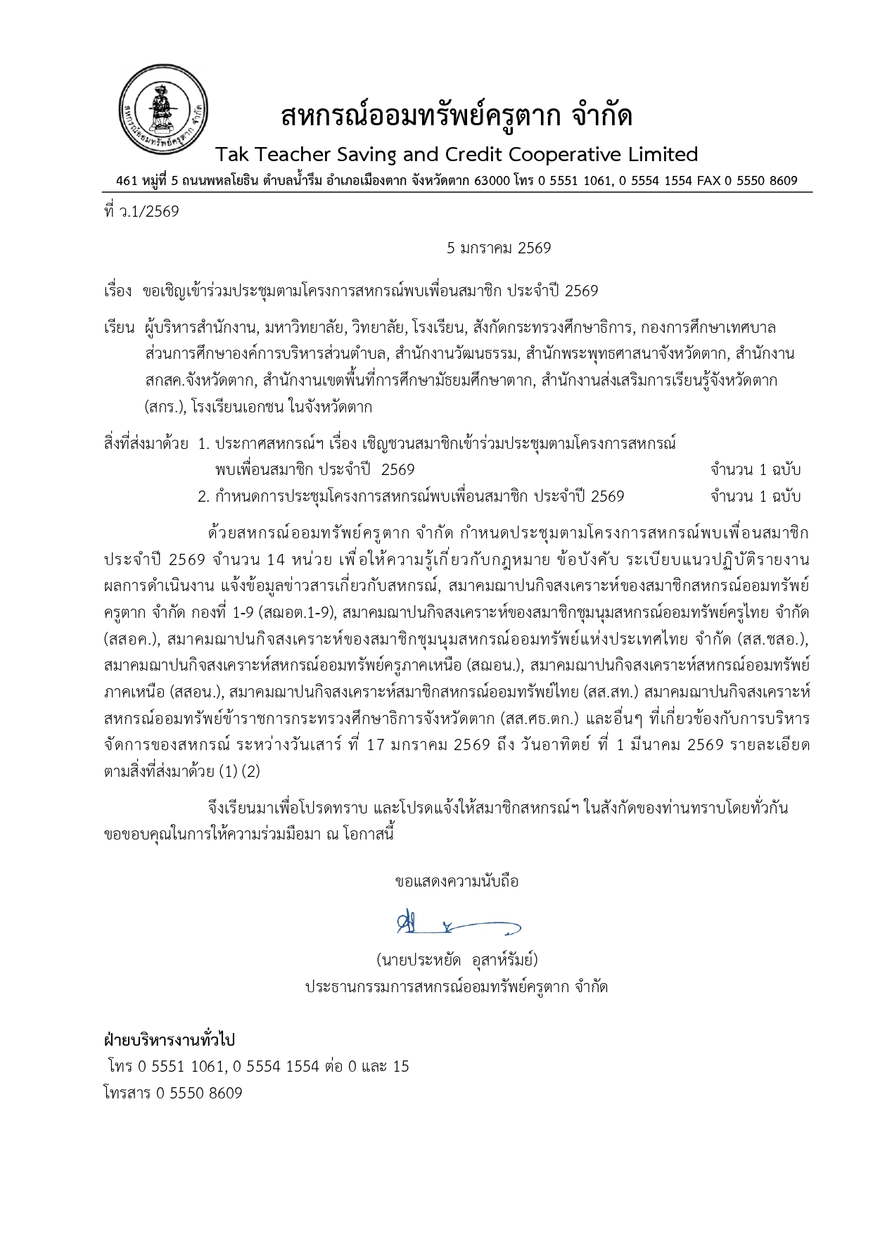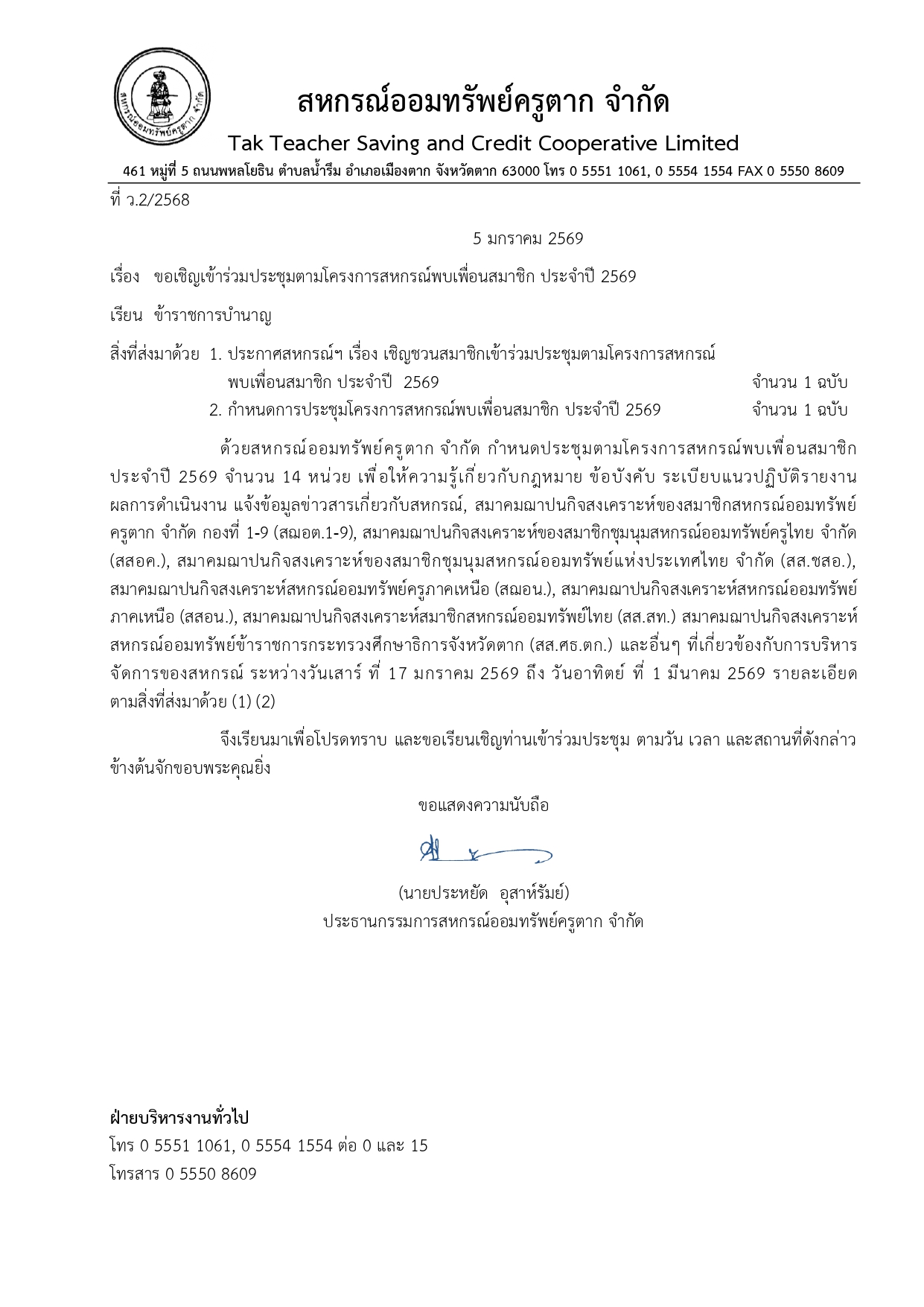 ประกาศ เขิญชวนสมาชิกเข้าร่วมโครงการสหกรณ์พบเพื่อนสมาชิก ประจำปี 2569